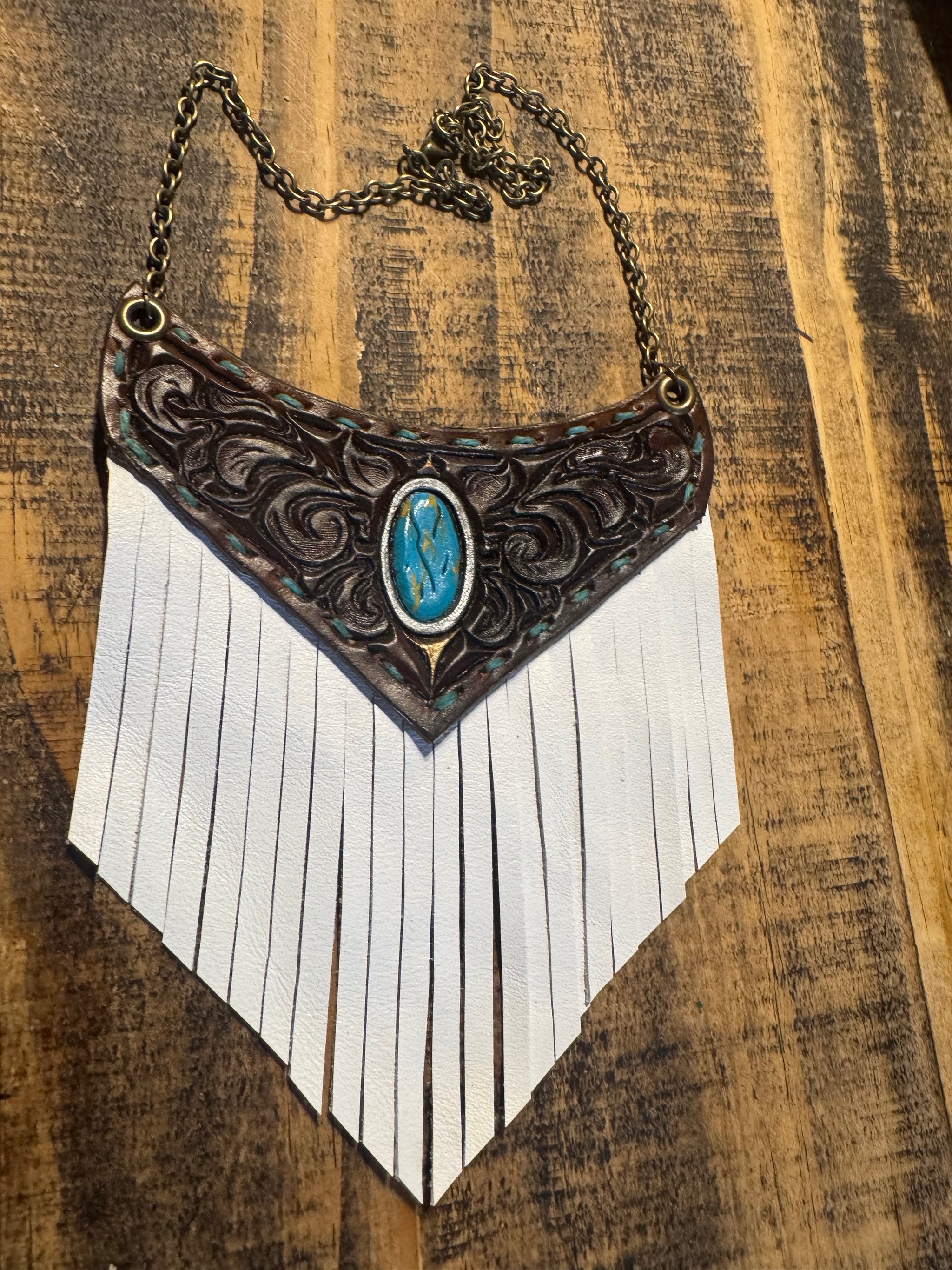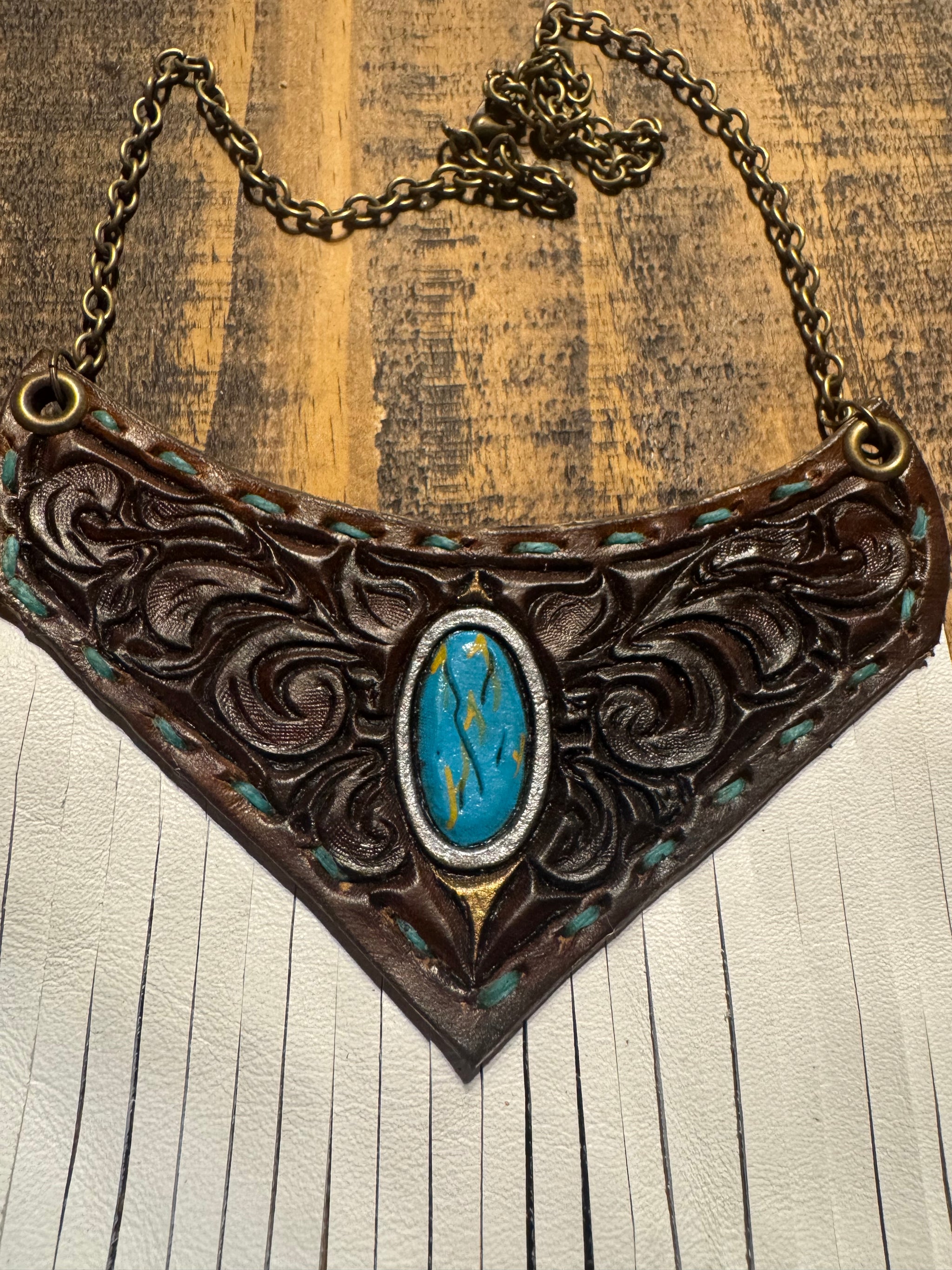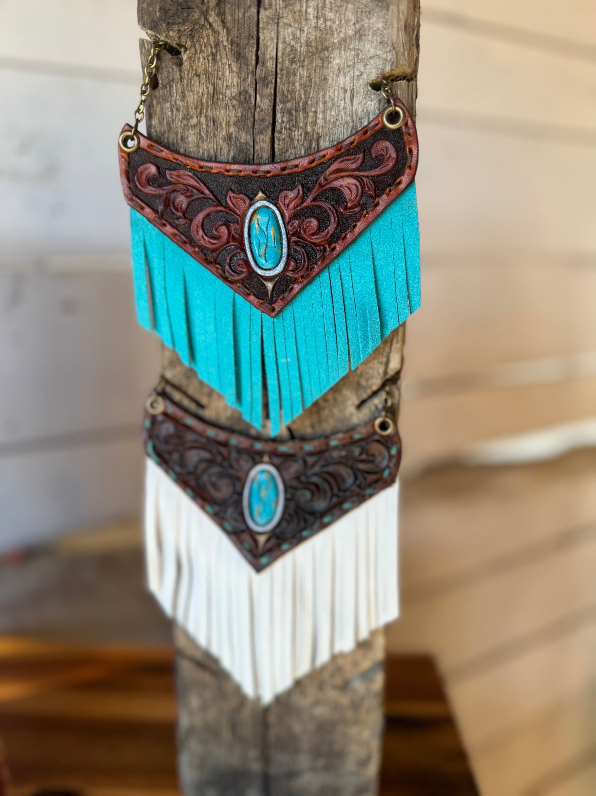Hand tooled turquoise pattern on beautiful dyed walnut! With White fringe to maker Pop!